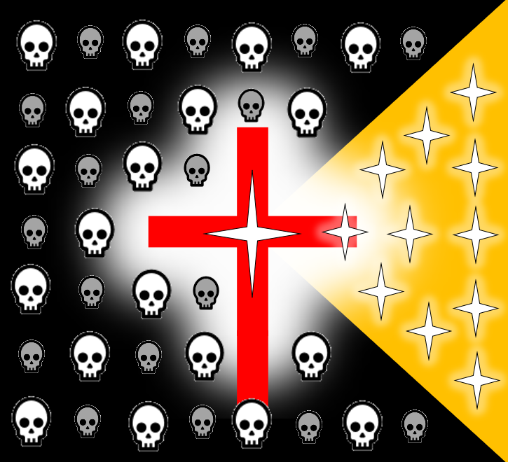 You may wonder, “What do the Skulls and Stars represent?”. To answer that, we first need to see that Jesus Christ’s death on the Cross is the only way Mankind can be Saved from the Darkness of Eternal Separation from God (Spiritual Death). God’s Presence is represented by the Gold area, while the Black area represents what we all face apart from what Jesus did in dying for us on the Cross.